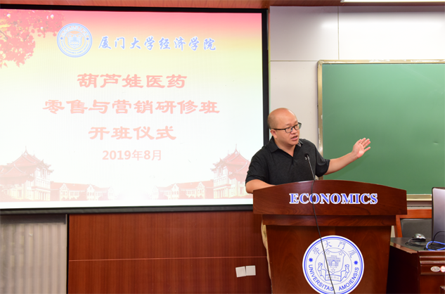 在开班仪式上,廖景峰主任首先代表厦门大学经济学院热烈欢迎优发国际医药零售与营销研修班的学员到厦大学习,并就厦门大学及经济学院的相关情况进行了介绍。他说,优发国际学员走进厦大就是厦大的校友,希望未来的日子能够关心、支持母校的发展,多提宝贵意见,同时他也祝大家在厦大学习期间学有所成、学有所获。