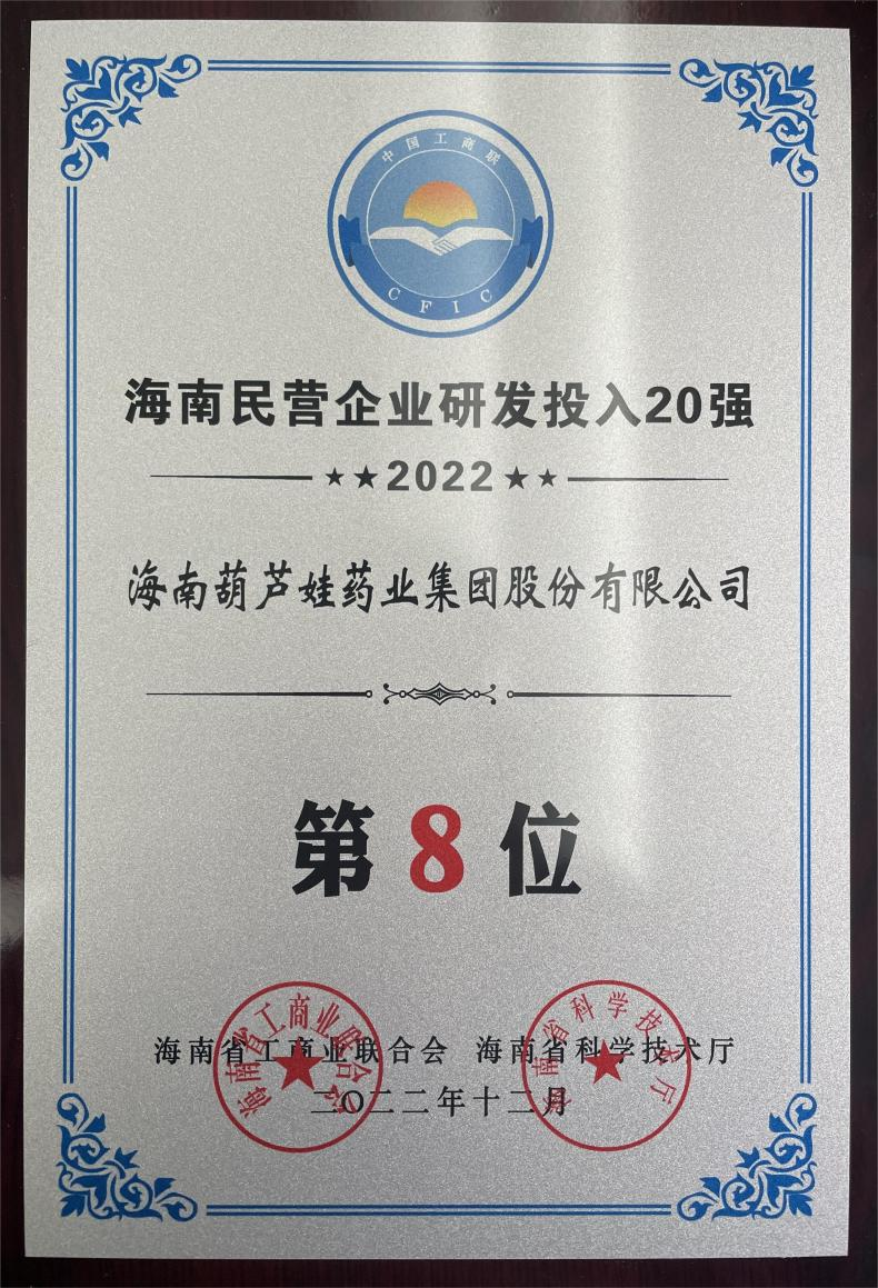 12月23日,2022海南民营企业50强和研发投入20强发布会在海口举行。会上发布了“2022海南民营企业50强”“2022海南民营企业研发投入20强”榜单和分析报告。优发国际药业再次荣登两榜,在海南民营企业50强榜单中位列第25位,较去年上升8位,这也是公司连续三年登榜;在海南民营企业研发投入20强中位列第8位,较去年上升7位。