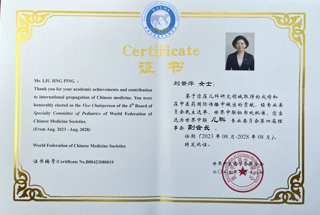 优发国际药业集团党委书记、董事长刘景萍当选世界中医药学会联合会儿科专业委员会第四届理事会副会长